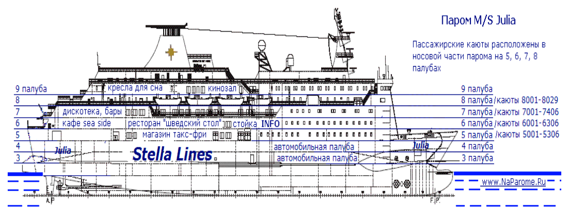 Комфортабельный 9-ти палубный паром. На верхней 9 палубе парома расположен кинозал, кресла для сна и детская игровая комната. На 7 и 6 палубе дискотека и бары, ресторан со «шведским столом» и кафе sea side. На 5 палубе парома расположен магазин такс- фри и магазин косметики. На 3 и 4 уровне располагаются автомобильные палубы. На 5,6,7,8 палубах расположены комфортабельные уютные каюты. На 6 палубе имеется телефон и стенд с необходимой справочной информацией. Для размещения пассажиров на пароме предусмотрены: